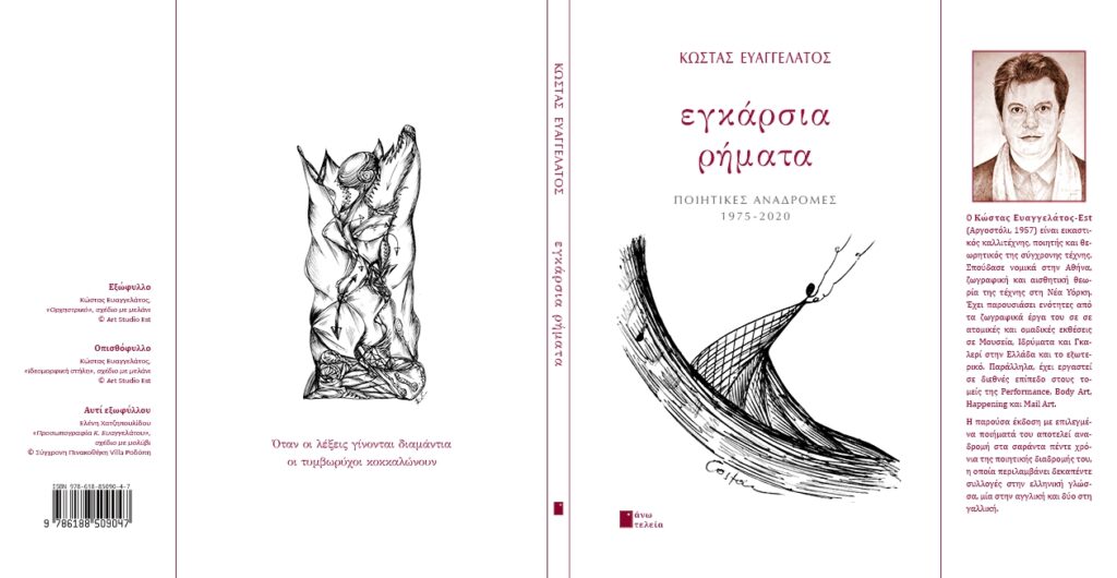 Την Παρασκευή 4 Νοεμβρίου 2022, ώρα 19:30 ο Κώστας Ευαγγελάτος, εικαστικός, λογοτέχνης, θεωρητικός της τέχνης, θα παρουσιάσει την νέα ποιητική συλλογή του με τίτλο “Εγκάρσια Ρήματα”, εκ. ΑΝΩ ΤΕΛΕΙΑ. Θα απαγγείλει ποιήματα και θα διαβάσει το θεωρητικό του κείμενο “Εκφραστικός λόγος εν αινίγματι” στην Αίθουσα Τέχνης του Ελληνογαλλικού Συνδέσμου, Πλατεία Φιλικής Εταιρίας 2, Κολωνάκι, Αθήνα.