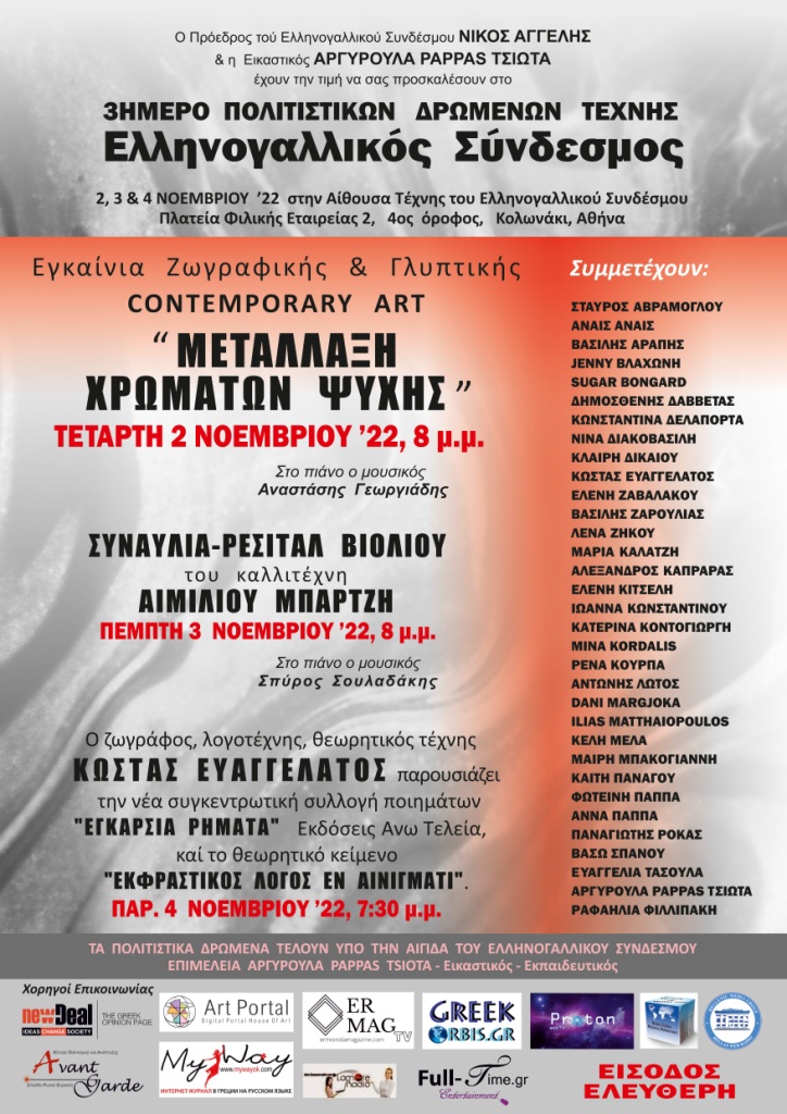 Η λογοτεχνική εκδήλωση γίνεται στα πλαίσια τουΤριήμερου Πολιτιστικών Δρώμενων Τέχνης CONTEMPORARY ART ( 2, 3, 4 Νοεμβρίου 2022), που διοργανώνει και επιμελείται η εικαστικός και εκπαιδευτικός κ. Ρούλα Πάππας-Τσιώτα και πραγματοποιείται υπό την αιγίδα του Ελληνογαλικού Συνδέσμου, με την στήριξη του Προέδρου του κ. Νικόλαου Αγγελή.
