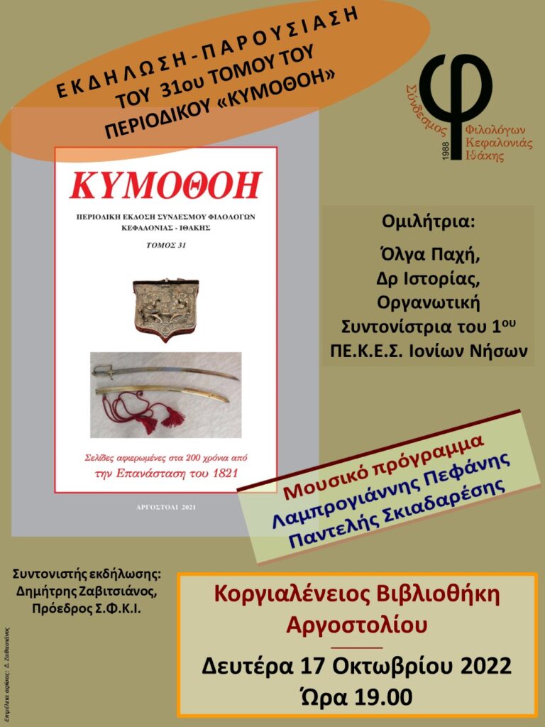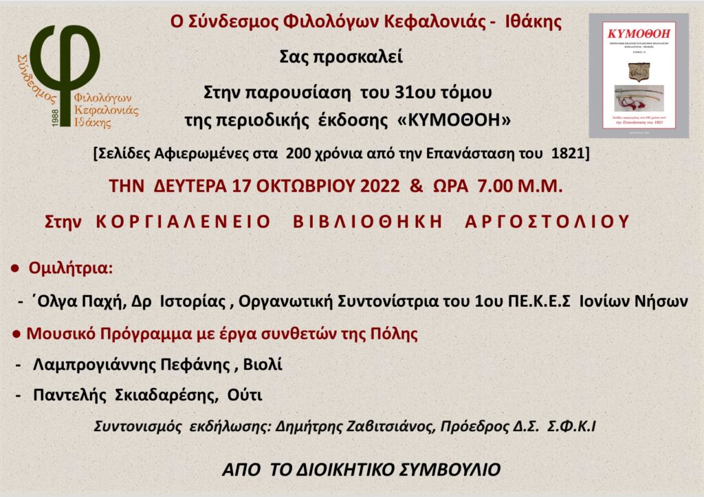 Σας υπενθυμίζουμε την Εκδήλωση- Παρουσίαση του 31ου τόμου της περιοδικής έκδοσης του Συνδέσμου μας “ΚΥΜΟΘΟΗ” που θα πραγματοποιηθεί την Δευτέρα 17 Οκτωβριου 2022 στις 19.00 στην Κοργιαλένειο Βιβλιοθήκη Αργοστολίου.