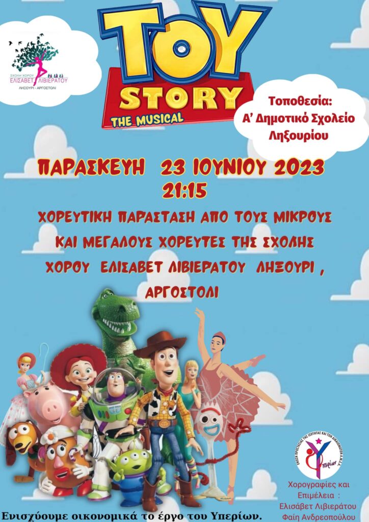 Θα πραγματοποιηθεί χορευτική παράσταση με τίτλο «TOY STORY» την Παρασκευή 23 Ιουνίου στον προαύλιο χώρο του Α Δημοτικού σχολείου Ληξουρίου, στις 21.15 μμ από την ΣΧΟΛΗ ΧΟΡΟΥ ΕΛΙΣΑΒΕΤ ΛΙΒΙΕΡΑΤΟΥ ΛΗΞΟΥΡΙ – ΑΡΓΟΣΤΟΛΙ.