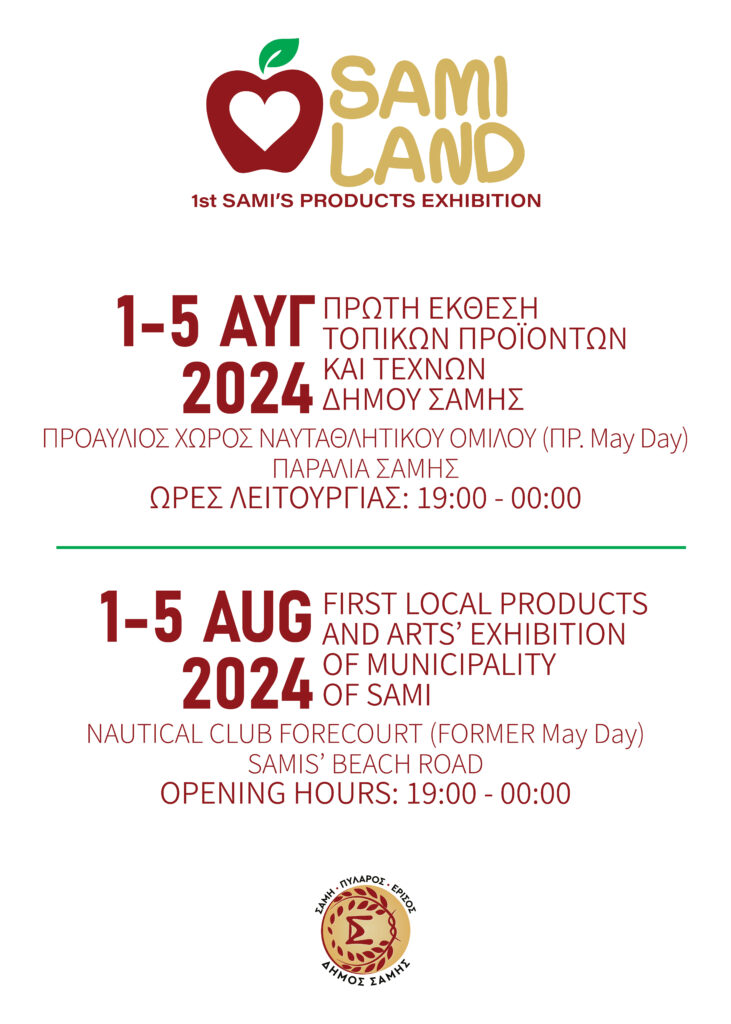Η SAMILAND, η 1η Έκθεση Τοπικών Προϊόντων και Τεχνών του Δήμου Σάμης είναι γεγονός και αναμένεται να ανοίξει τις πύλες της την Πέμπτη, 1η Αυγούστου 2024. Η Έκθεση θα διαρκέσει από την Πέμπτη, 1η Αυγούστουέως και τη Δευτέρα, 5 Αυγούστου 2024 με ωράριο λειτουργίας από τις 19.00 έως τις 00.00!