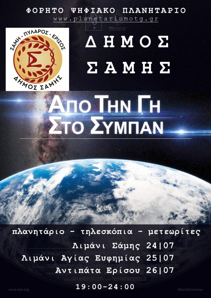 Ο Δήμος Σάμης φέρνει για ακόμη μία φορά το Φορητό Ψηφιακό Πλανητάριο σε Σάμη, Πύλαρο και Έρισο στις 24, 25 και 26 Ιουλίου αντίστοιχα.