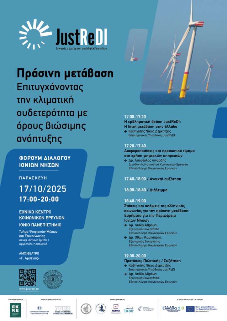 Η εκδήλωση θα διεξαχθεί στο Αμφιθέατρο «Γ. Αρσένης» (Λεωφόρος Αντώνη Τρίτση 1, Αργοστόλι, Κεφαλονιά) και διοργανώνεται στο πλαίσιο της εμβληματικής Δράσης «Ανθεκτικότητα, συμπερίληψη, και ανάπτυξη: Προς μια δίκαιη πράσινη και ψηφιακή μετάβαση των ελληνικών Περιφερειών» (JustReDI), που υλοποιείται από μια κοινοπραξία Ερευνητικών Κέντρων (ΕΚΚΕ, ΕΑΑ, ΑΘΗΝΑ, ΕΛΚΕΘΕ) και Πανεπιστημίων (ΠΑΔΑ, ΔΙΠΑΕ). Η Δράση έχει στόχο να αναδείξει τις δυνατότητες και τα εμπόδια που προκύπτουν για τις τοπικές κοινωνίες και οικονομίες εν όψει της πράσινης και ψηφιακής μετάβασης.