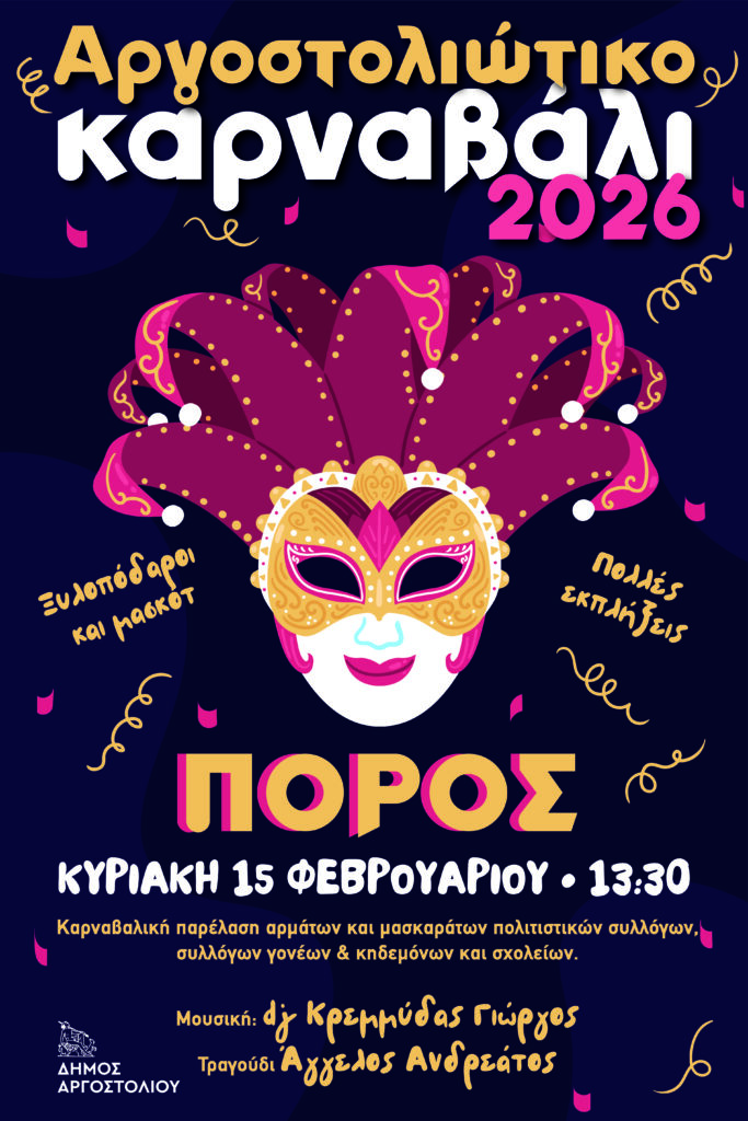 Την Κυριακή 15 Φεβρουαρίου, στις 13:30, ο Πόρος ντύνεται αποκριάτικα και υποδέχεται τηνκεφάτη Καρναβαλική Παρέλαση, γεμάτη μουσική, χρώμα και χορό!
