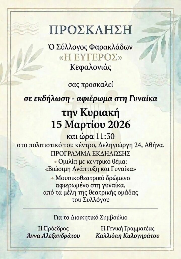 ΑρχικήΑΝΑΚΟΙΝΩΣΕΙΣ ΑΝΑΚΟΙΝΩΣΕΙΣ Η Εύγερος | Πρόσκληση σε εκδήλωση αφιέρωμα για τη γυναίκα 0 12/03/2026 FacebookTwitterLinkedinEmailViber FacebookTwitterLinkedinEmailViber Προηγούμενο άρθροΟ Σπάρτακος | Προβολή ταινίας “Πειθαρχική Μεραρχία 999” στον ΚέφαλοΕπόμενο άρθροΟΚΑΠ | Ισορροπημένη διατροφή & παχυσαρκία: τι πρέπει να γνωρίζουμε ΑΦΗΣΤΕ ΜΙΑ ΑΠΑΝΤΗΣΗ Ακύρωση απάντησης Σχόλιο: εισάγετε το σχόλιό σας! Όνομα:* παρακαλώ εισάγετε το όνομά σας εδώ Email:* έχετε εισάγει εσφαλμένη διεύθυνση ηλεκτρονικού ταχυδρομείου! παρακαλώ εισάγετε εδώ την ηλεκτρονική σας διεύθυνση Ιστοσελίδα: αποθηκεύστε το όνομα, το ηλεκτρονικό ταχυδρομείο και τον ιστότοπό μου σε αυτό το πρόγραμμα περιήγησης για την επόμενη φορά που θα σχολιάσω. ΤΕΛΕΥΤΑΙΑ ΝΕΑΙΣΤΟΡΙΑΝίκος Μαραγκάκης: Μία λιγότερο γνωστή προδοσία που έπαιξε καθοριστικό ρόλο στο Μεσολόγγι (video)20/04/2026ΠΟΛΙΤΙΣΜΟΣΗ παράσταση «Ιθάκη | Ένα ταξίδι επιστροφής και αυτογνωσίας στο Δημοτικό Θέατρο Αργοστολίου20/04/2026ΚΑΘΗΜΕΡΙΝΟΤΗΤΑΑργοστόλι | Ενώνουμε δυνάμεις για τον καθαρισμό του Κουτάβου αυτή την Κυριακή!20/04/2026Status quo200 Χρόνια από την Έξοδο του Μεσολογγίου: Μια πολυεπιστημονική προσέγγιση με ιστορική τεκμηρίωση και ερμηνευτικό βάθος (video)20/04/2026PODCASTPODCAST | Η Ευρώπη Μοσχονά Viva Voce στα FM με τον Γιάννη Βαρούχα20/04/2026 Παρόμοια Άρθρα ΑΝΑΚΟΙΝΩΣΕΙΣ Ιδρύθηκε Παράρτημα της Ελληνικής Μαθηματικής Εταιρείας στο Αργοστόλι 20/04/2026 ΑΝΑΚΟΙΝΩΣΕΙΣ Ο Κώστας Χαριτάτος συζητά με τον Γιάννη Βαρούχα αυτό το Σάββατο ζωντανά στον αέρα! 16/04/2026 ΑΝΑΚΟΙΝΩΣΕΙΣ Ευχές-μηνύματα πολιτιστικών και πολιτικών φορέων για το Πάσχα 2026 08/04/2026 ΑΝΑΚΟΙΝΩΣΕΙΣ Κοργιαλένειο Μουσείο | Αφιέρωμα στα 200 χρόνια από την Έξοδο του Μεσολογγίου 06/04/2026 ΑΝΑΚΟΙΝΩΣΕΙΣ Ιακωβάτειος | Τα μέλη του νέου Εφορευτικού Συμβουλίου και η πρώτη διακοίνωση 06/04/2026 ΔΗΜΟΦΙΛΗ ΑΡΘΡΑ Αίνος | του Πάνου Σταθάτου 03/03/2022 Ένα βίντεο από το 3ο Γυμνάσιο Αργοστολίου για τη γυναίκα 18/03/2022 Σε Στελιάτα, Μπαταριά, Δαφνούδι, Κιμηλιά και Έμπλυση η Ορειβατική Λέσχη (εικόνες) 29/06/2022 Πανσέληνος απ’ την παραλία Άβυθος | Πάνος Σταθάτος 07/07/2022 Μετά από 4 γενιές η οικογένεια Πετράτου σταματάει τη διανομή εφημερίδων 06/07/2022 Αφιέρωμα στο ηλιοβασίλεμα με πέντε μαγικές φωτογραφίες από τον Πάνο Σταθάτο. 18/07/2022 Το ARK στα σχολεία (εικόνες) 24/04/2023 Διονύσης Γασπαρινάτος / Λιμνοθάλασσα Κουτάβου 22/05/2024 Ωραίο το φουστάνι σου Γιώργο μου… αλλά… | π. Ξενοφώντας Ζαρκάδας 04/02/2024 Κάπου στην Κεφαλονιά… | Jerry Apostolatos 20/09/2023