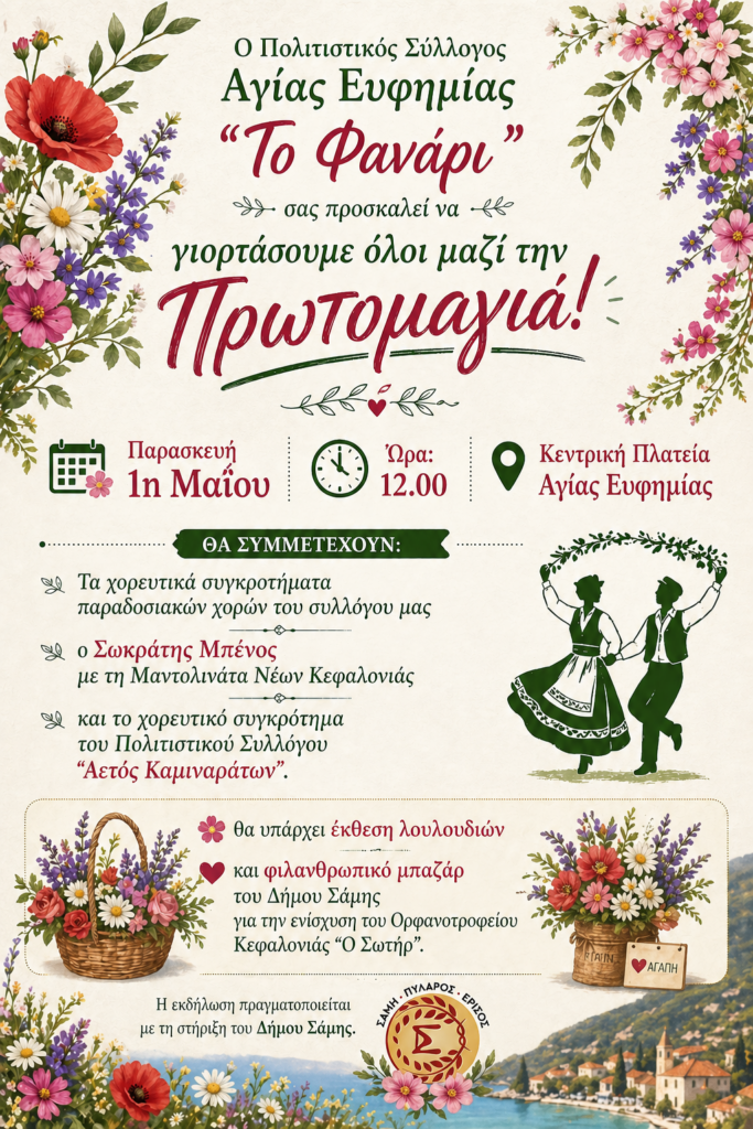 ΑρχικήΑΝΑΚΟΙΝΩΣΕΙΣ ΑΝΑΚΟΙΝΩΣΕΙΣ Πρωτομαγιά στην Αγία Ευφημία 0 28/04/2026 FacebookXLinkedinEmailViber FacebookXLinkedinEmailViber Προηγούμενο άρθροΠρωτομαγιά στον ΠόροΕπόμενο άρθροΔιάκριση για το Τμήμα Ψηφιακών Μέσων και τη φοιτήτριά του Ελένη Μελίνα Θεοδοσίου ΑΦΗΣΤΕ ΜΙΑ ΑΠΑΝΤΗΣΗ Ακύρωση απάντησης Σχόλιο: εισάγετε το σχόλιό σας! Όνομα:* παρακαλώ εισάγετε το όνομά σας εδώ Email:* έχετε εισάγει εσφαλμένη διεύθυνση ηλεκτρονικού ταχυδρομείου! παρακαλώ εισάγετε εδώ την ηλεκτρονική σας διεύθυνση Ιστοσελίδα: αποθηκεύστε το όνομα, το ηλεκτρονικό ταχυδρομείο και τον ιστότοπό μου σε αυτό το πρόγραμμα περιήγησης για την επόμενη φορά που θα σχολιάσω. ΤΕΛΕΥΤΑΙΑ ΝΕΑΑΘΛΗΤΙΚΑΓΕΚ | Πλούσια συγκομιδή στο Κ16 – Ξεχώρισε η 13χρονη Αριάδνη Αποστολάτου28/04/2026ΠΑΙΔΕΙΑΔιάκριση για το Τμήμα Ψηφιακών Μέσων και τη φοιτήτριά του Ελένη Μελίνα Θεοδοσίου28/04/2026ΑΝΑΚΟΙΝΩΣΕΙΣΠρωτομαγιά στον Πόρο28/04/2026ΤΟΠΙΚΑΑργοστόλι | Με νέα εικόνα το κατάστημα ΔΕΗ στην παραλιακή28/04/2026ΑΝΑΚΟΙΝΩΣΕΙΣΕπιτροπή Ειρήνης Κεφαλονιάς & Ιθάκης | Καλλιτεχνικό εργαστήρι για την ειρήνη28/04/2026 Παρόμοια Άρθρα ΑΝΑΚΟΙΝΩΣΕΙΣ Πρωτομαγιά στον Πόρο 28/04/2026 ΑΝΑΚΟΙΝΩΣΕΙΣ Επιτροπή Ειρήνης Κεφαλονιάς & Ιθάκης | Καλλιτεχνικό εργαστήρι για την ειρήνη 28/04/2026 ΑΝΑΚΟΙΝΩΣΕΙΣ ΑΝΑΚΑΡΑ | Προβολή της ταινίας “BIRD” αυτό το Σάββατο 25/4/26 (trailer) 23/04/2026 ΑΝΑΚΟΙΝΩΣΕΙΣ Rock συναυλία των μαθητών της Φιλαρμονικής Σχολής Κεφαλληνίας 21/04/2026 ΑΝΑΚΟΙΝΩΣΕΙΣ Ιόνιο Κέντρο Πολιτισμού | Ατομική έκθεση ζωγραφικής Robert Rickerson 21/04/2026 ΔΗΜΟΦΙΛΗ ΑΡΘΡΑ Αίνος | του Πάνου Σταθάτου 03/03/2022 Ένα βίντεο από το 3ο Γυμνάσιο Αργοστολίου για τη γυναίκα 18/03/2022 Σε Στελιάτα, Μπαταριά, Δαφνούδι, Κιμηλιά και Έμπλυση η Ορειβατική Λέσχη (εικόνες) 29/06/2022 Πανσέληνος απ’ την παραλία Άβυθος | Πάνος Σταθάτος 07/07/2022 Μετά από 4 γενιές η οικογένεια Πετράτου σταματάει τη διανομή εφημερίδων 06/07/2022 Αφιέρωμα στο ηλιοβασίλεμα με πέντε μαγικές φωτογραφίες από τον Πάνο Σταθάτο. 18/07/2022 Το ARK στα σχολεία (εικόνες) 24/04/2023 Διονύσης Γασπαρινάτος / Λιμνοθάλασσα Κουτάβου 22/05/2024 Ωραίο το φουστάνι σου Γιώργο μου… αλλά… | π. Ξενοφώντας Ζαρκάδας 04/02/2024 Κάπου στην Κεφαλονιά… | Jerry Apostolatos 20/09/2023