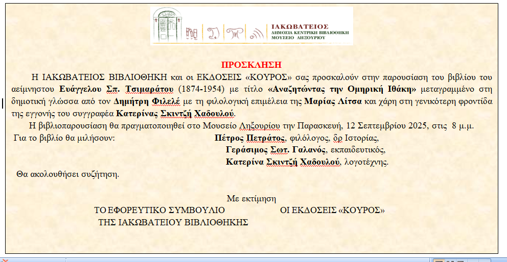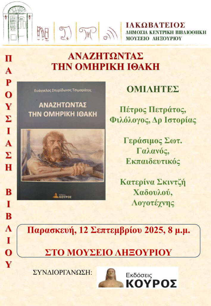 Η Ιακωβάτειος Βιβλιοθήκη θα παρουσιάσει στο Μουσείο Ληξουρίου, στις 12 Σεπτεμβρίου, 8 μ.μ., το έργο του αείμνηστου Ευάγγελου Σπ. Τσιμαράτου (1874-1954) «Αναζητώντας την Ομηρική Ιθάκη» μεταγραμμένο στη δημοτική γλώσσα από τον Δημήτρη Φιλελέ με τη φιλολογική επιμέλεια της Μαρίας Λίτσα και χάρη στη γενικότερη φροντίδα της εγγονής του συγγραφέα Κατερίνας Σκιντζή Χαδουλού.