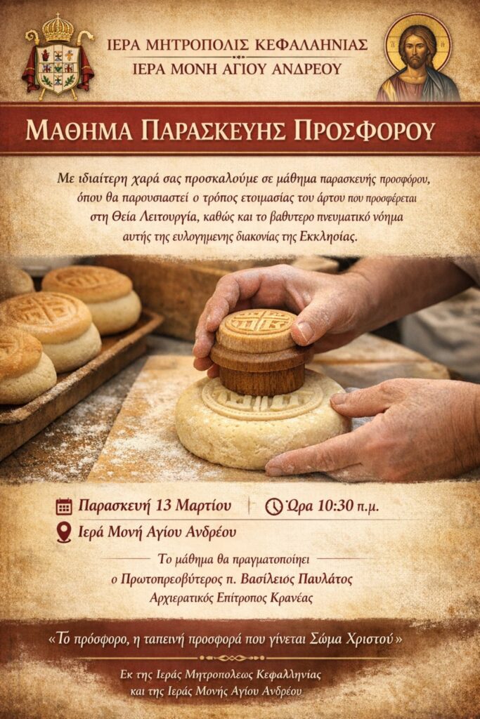 ΑρχικήΕΚΚΛΗΣΙΑ ΕΚΚΛΗΣΙΑ ΙΜ Αγίου Ανδρέου | Μάθημα παρασκευής πρόσφορου 0 11/03/2026 FacebookTwitterLinkedinEmailViber FacebookTwitterLinkedinEmailViber Προηγούμενο άρθροΠαρουσίαση Βιβλίου στον Κέφαλο | Μετά τον έρωτα, τι;Επόμενο άρθροΑΝΑΚΑΡΑ | Ροκ συναυλία με ελεύθερη είσοδο και δυνατά ονόματα! ΑΦΗΣΤΕ ΜΙΑ ΑΠΑΝΤΗΣΗ Ακύρωση απάντησης Σχόλιο: εισάγετε το σχόλιό σας! Όνομα:* παρακαλώ εισάγετε το όνομά σας εδώ Email:* έχετε εισάγει εσφαλμένη διεύθυνση ηλεκτρονικού ταχυδρομείου! παρακαλώ εισάγετε εδώ την ηλεκτρονική σας διεύθυνση Ιστοσελίδα: αποθηκεύστε το όνομα, το ηλεκτρονικό ταχυδρομείο και τον ιστότοπό μου σε αυτό το πρόγραμμα περιήγησης για την επόμενη φορά που θα σχολιάσω. ΤΕΛΕΥΤΑΙΑ ΝΕΑΙΣΤΟΡΙΑΝίκος Μαραγκάκης: Μία λιγότερο γνωστή προδοσία που έπαιξε καθοριστικό ρόλο στο Μεσολόγγι (video)20/04/2026ΠΟΛΙΤΙΣΜΟΣΗ παράσταση «Ιθάκη | Ένα ταξίδι επιστροφής και αυτογνωσίας στο Δημοτικό Θέατρο Αργοστολίου20/04/2026ΚΑΘΗΜΕΡΙΝΟΤΗΤΑΑργοστόλι | Ενώνουμε δυνάμεις για τον καθαρισμό του Κουτάβου αυτή την Κυριακή!20/04/2026Status quo200 Χρόνια από την Έξοδο του Μεσολογγίου: Μια πολυεπιστημονική προσέγγιση με ιστορική τεκμηρίωση και ερμηνευτικό βάθος (video)20/04/2026PODCASTPODCAST | Η Ευρώπη Μοσχονά Viva Voce στα FM με τον Γιάννη Βαρούχα20/04/2026 Παρόμοια Άρθρα ΕΚΚΛΗΣΙΑ Πρόγραμμα μηνός Μαρτίου 2026 & Μεγάλης 40ης 2026 του Σεβ. Μητροπολίτου Κεφαλληνίας κ. Δημητρίου 27/02/2026 ΕΚΚΛΗΣΙΑ Πρόγραμμα μηνός Φεβρουαρίου 2026 Σεβ. Μητροπολίτου Κεφαλληνίας κ. Δημητρίου 02/02/2026 ΕΚΚΛΗΣΙΑ Πανηγυρίζει τό Παρεκκλήσιον τῆς Ὑπαπαντῆς τοῦ Κυρίου τοῦ ἀειμνήστου Παναγῆ Γεράκη 29/01/2026 ΕΚΚΛΗΣΙΑ Τριών Ιεραρχών | Εορταστική εκδήλωση από το 2ο ΔΣ Αργοστολίου 28/01/2026 ΕΚΚΛΗΣΙΑ Μητροπολίτης | Πρόγραμμα Δεκεμβρίου 2025 11/12/2025 ΔΗΜΟΦΙΛΗ ΑΡΘΡΑ Αίνος | του Πάνου Σταθάτου 03/03/2022 Ένα βίντεο από το 3ο Γυμνάσιο Αργοστολίου για τη γυναίκα 18/03/2022 Σε Στελιάτα, Μπαταριά, Δαφνούδι, Κιμηλιά και Έμπλυση η Ορειβατική Λέσχη (εικόνες) 29/06/2022 Πανσέληνος απ’ την παραλία Άβυθος | Πάνος Σταθάτος 07/07/2022 Μετά από 4 γενιές η οικογένεια Πετράτου σταματάει τη διανομή εφημερίδων 06/07/2022 Αφιέρωμα στο ηλιοβασίλεμα με πέντε μαγικές φωτογραφίες από τον Πάνο Σταθάτο. 18/07/2022 Το ARK στα σχολεία (εικόνες) 24/04/2023 Διονύσης Γασπαρινάτος / Λιμνοθάλασσα Κουτάβου 22/05/2024 Ωραίο το φουστάνι σου Γιώργο μου… αλλά… | π. Ξενοφώντας Ζαρκάδας 04/02/2024 Κάπου στην Κεφαλονιά… | Jerry Apostolatos 20/09/2023