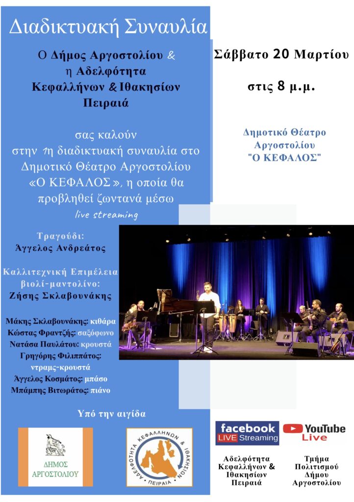 Ο Δήμος Αργοστολίου και η Αδελφότητα Κεφαλλήνων & Ιθακησίων Πειραιά σας καλούν στην 1η διαδικτυακή συναυλία στο Δημοτικό Θέατρο Αργοστολίου «Ο ΚΕΦΑΛΟΣ», η οποία θα προβληθεί ζωντανά μέσω live streaming, το Σάββατο 20 Μαρτίου 2021 στις 8:00 μ.μ.