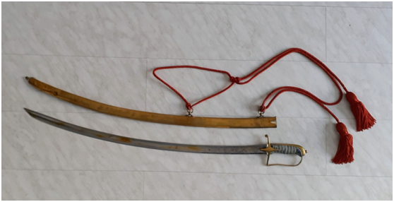Φέρει μπρούτζινη θήκη και κορδόνι ανάρτησης. Είναι ένα από τα 335 όμοια σπαθιά που κατασκευάστηκαν στη Γαλλία το 1824. Στη λάμα, κοντά στη λαβή φέρει επιμελημένη, εγχάρακτη διακόσμηση: στη μία πλευρά ουσσάρο και στην άλλη έφιππο ουσσάρο.