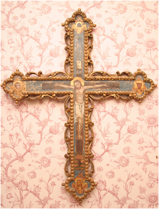 Ο Σταυρός, άγνωστης προέλευσης, ανήκε σε  επίστεψη τέμπλου. Έχει μακρότερη την κατακόρυφη κεραία και φέρει στο περίγραμμά του επίχρυσο, ξυλόγλυπτο,κοκκιδωτόκόσμημα, το οποίο περιβάλλεται από συνεχές,  απλοποιημένο φυτικό.