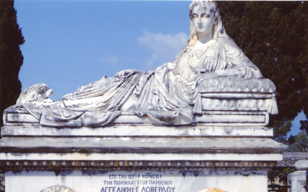 Η μαρμάρινη, περίτεχνη και αρμονική κοριτσίστικη μορφή της Αγγελικής Λοβέρδου που ατενίζει με γλυκύτητα από έναν υπερβατικό γαλήνιο κόσμο, έχοντας στην άκρη των ποδιών της το όμορφο σκυλάκι της ήταν για μένα αλλά και για πολλούς επισκέπτες του Δραπάνου ένα μυσταγωγικό έργο τέχνης που μετέδιδε αισθητική συγκίνηση και ομορφιά. Δυστυχώς οι κλιματολογικές συνθήκες, η εντόπια σεισμική ακολουθία πολλών χρόνων έχουν αλλοιώσει σταδιακά μέχρι σήμερα τα λεπτεπίλεπτα χαρακτηριστικά της αναπαυόμενης και η οξείδωση του μαρμάρου έχει προχωρήσει βαθιά. Εν τούτοις η εκφραστική δύναμη της σύνθεσης παραμένει και η επικίνδυνη ορατή φθορά επιτείνει το αίσθημα της περίλυπης διαχρονικά ψυχής για την απώλεια νεαρών αγαπημένων προσώπων. Η «Αναπαυόμενη» σε ανάκλιντρο υπήρξε για μένα υπόδειγμα της νεοελληνικής γλυπτικής παράλληλα με τα αδρά μνημειακά έργα του μαθητή του Φιλιππότη, κορυφαίου γλύπτη Γεωργίου Μπονάνου που βρίσκονται στο ίδιο κοιμητήριο. Μάλιστα για χρόνια καθάριζα ευλαβικά και τακτικά τον τάφο της Αναπαυόμενης από τα αγριόχορτα σε εποχές που δεν λειτουργούσαν κανονικά οι δημοτικές υπηρεσίες, γράφοντας σχετικά άρθρα στον τοπικό τύπο για την διάσωση του. Το 2004 έδωσα διάλεξη για το επιτάφιο μνημείο στην Εραλδική και Γενεαλογική Εταιρεία Ελλάδος στην Αθήνα με κύρια αναφορά στην ανάγκη συντήρησης και προστασίας του.
