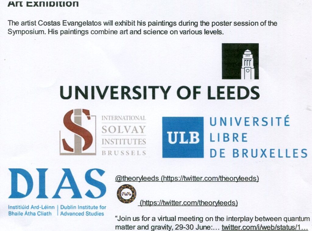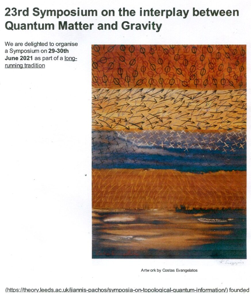 Έκθεση και προβολή ζωγραφικών συνθέσεων του Κώστα Ευαγγελάτου θα πραγματοποιηθεί στις 29 και 30 Ιουνίου 2021 στα πλαίσια του 23ου διεθνούς επιστημονικού Συμποσίου Κβαντικής Τοπολογικής Πληροφορικής που διοργανώνεται στο Τμήμα Φυσικής και Αστρονομίας του Πανεπιστημίου του LEEDS. U.K. Υπεύθυνος του Συμποσίου, το οποίο θα ασχοληθεί με τα πλέον σύγχρονα θέματα κβαντικής φυσικής είναι ο καθηγητής J.K.Pachos. Συνδυάζοντας τη φυσική, τα μαθηματικά και την πληροφορική, τοπολογικοί κβαντικοί υπολογιστές είναι ένας ταχέως αναπτυσσόμενος χώρος έρευνας, που επικεντρώνεται στη διερεύνηση των κβαντικών εξελίξεων που δεν επηρεάζονται από σφάλματα. Η κατασκευή των τοπολογικών συστημάτων, οι ιδιότητες τους και η υπολογιστική τους ισχύ βοηθούν την κατανόηση της ύλης και των αδιερεύνητων φάσεων της. Ο εικαστικός και θεωρητικός τέχνης Κώστας Ευαγγελάτος ήδη από το 1984-85 στη Νέα Υόρκη μέχρι και σήμερα συνθέτει την μεγάλη και σημαντική αυτή ενότητα έργων του που θα εκτεθεί και η οποία άπτεται της σχέσης τέχνης και επιστήμης, με χειρονομιακό χαρακτήρα και ζωγραφική οπτικοποίηση. Δημιουργεί συμπλέγματα με ιδιαίτερη έμφαση στην εκφραστική δύναμη της φυσικής διαίσθησης και των συμβολικών αναγωγών, πίσω από τις μαθηματικές έννοιες, σε αυτό το νέο και συναρπαστικό πεδίο εννοιακής εικαστικής έρευνας που εκτυλίσσεται αέναα και συναρπαστικά στην υπαρκτή και “εξωτική” επιπεδοχώρα. Θα εκτεθούν έργα του καλλιτέχνη που ανήκουν στην μόνιμη συλλογή του Πανεπιστημίου του Λήντς, τα οποία είχαν παρουσιαστεί με επιτυχία στην ατομική έκθεση του εκεί το 2017, με τίτλο: Εισβολή Τέχνης – Art Invasion. Θα προβληθούν επίσης τα δύο ζωγραφικά σχέδια που φιλοτέχνησε για το βιβλίο – Introduction to Topological Quantum Computation, Jiannis K. Pachos, edition Cambridge University Press-, το οποίο είχε παρουσιαστεί επίσημα το 2012 στο Παρίσι, Poincare Institute – Ινστιτούτο Πουανκαρέ στη Σορβόνη καθώς και πολλά νέα έργα με μικτές τεχνικές που θα εκτεθούν για πρώτη φορά. Ορισμένα βασίζονται σε γραμμικές υποδείξεις που του πρόσφερε ο κορυφαίος καθηγητής μαθηματικών, στατιστικής και τοπολογίας στο University of Illinois at Chicago, prof. Louis Kauffman όταν είδε εννοιακά έργα του στο Παλαιό Πανεπιστήμιο στην Αθήνα.