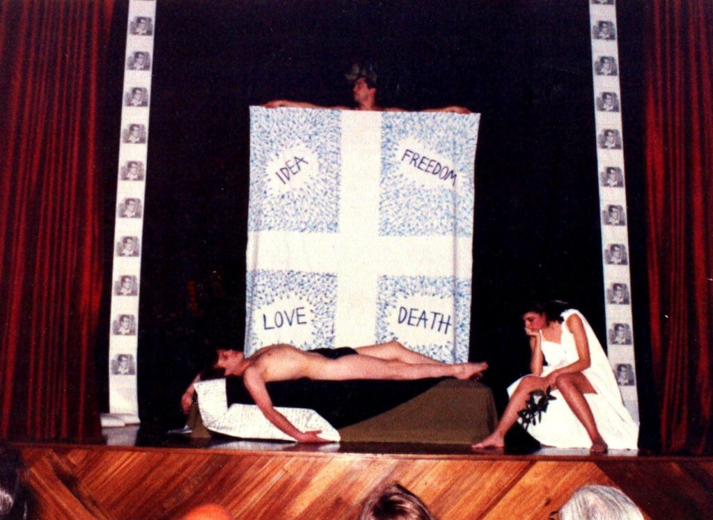 Η ωριαία θέαση του έργου μου με την παράλληλη μουσική ερμηνεία ποιημάτων του Byron, μελοποιημένων από τον Ίωνα Ζώτο, πρώτο καθηγητή της έδρας της Μουσικολογίας του Πανεπιστημίου Αθηνών από ορχήστρα στο υπερώο του αμφιθεάτρου προκάλεσε πολλαπλά έντονες και θετικές εντυπώσεις. Αυτή λοιπόν την ιδιότυπη βυρωνική σημαία την ενέταξα στην πορεία σε ανάλογες performance και έργα πολυμέσων για τον ποιητή και τελικά μετά 33 χρόνια εκτίθεται πάλι με ένθετη την μορφή του Λόρδου Βύρωνα στο εικαστικό περιβάλλον που επιμελήθηκα. Συναισθηματική και τιμητική κατάθεση στην αλήστου μνήμης ιδεατή και “εμψυχωτική” προσφορά και θανή του.
