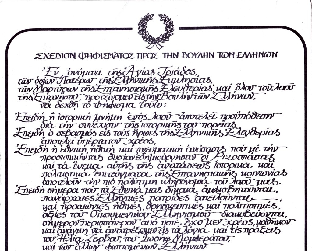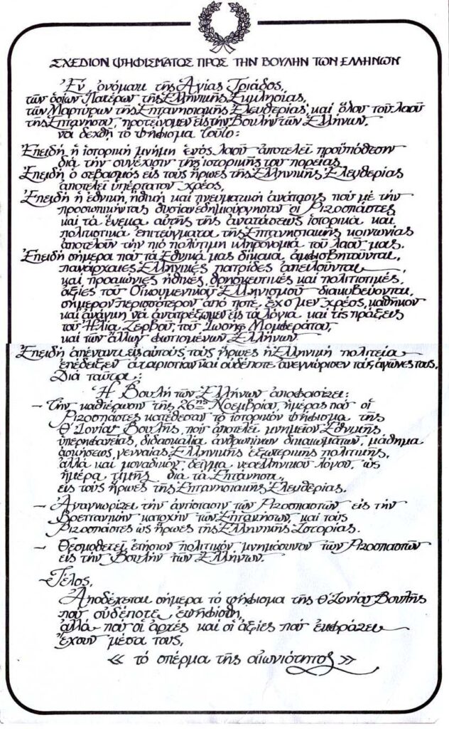 Μακάρι να γίνει η αναγνώριση του ψηφίσματος της 9ης Βουλής του 1850 και η καθιέρωση της ημερομηνίας 26 Νοεμβρίου, ημέρα που οι Ριζοσπάστες κατέθεσαν το ιστορικό ψήφισμα.