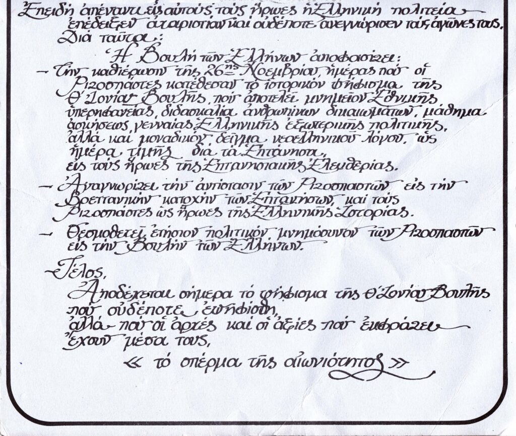 Ας αναλάβουμε οι Κεφαλονίτες τη δράση και τη τόλμη, ώστε αυτό το ψήφισμα «ΣΧΕΔΙΟΝ ΨΗΦΙΣΜΑΤΟΣ ΠΡΟΣ ΤΗΝ ΒΟΥΛΗΝ ΤΩΝ ΕΛΛΗΝΩΝ» με όσα υπαγορεύει, να γίνει δεκτό με πανηγυρικό τρόπο από την σημερινή Βουλή των Ελλήνων, μια και έχουμε την επετειακή των 160 χρόνων από την Ένωση το 2024. Επιτέλους, θα είναι το καλύτερο μνημόσυνο για τους Ριζοσπάστες, θα είναι η καλύτερη εορτή για τα Επτάνησα και ύψιστη τιμή για την Κεφαλονιά μας, που στάθηκε Αρχάγγελος Ριζοσπαστικής Ιδέας και Δράσης.