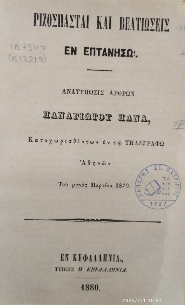 Στη συνέχεια τα άρθρα εκείνα συγκεντρώθηκαν σε ένα ιδιαίτερο βιβλίο με τον τίτλο Ριζοσπάσται και βελτιώσεις εν Επτανήσω και εκδόθηκαν από το τυπογραφείο «Η Κεφαλληνία» το 1880. Η καθυστέρηση της έκδοσης κατά ένα χρόνο, οφειλόταν, κατά το συγγραφέα Π. Πανά, στο ότι θέλησε ο ίδιος να συμπληρώσει και να διορθώσει κάποιες μικρές ανακρίβειες που παρεισέφρησαν στα αρχικά άρθρα του και συγχρόνως να προσθέσει επιπλέον σημειώσεις και διευκρινίσεις στο τελικό κείμενο για την καλύτερη δυνατή κατανόηση των γραφομένων από τους αναγνώστες του βιβλίου.