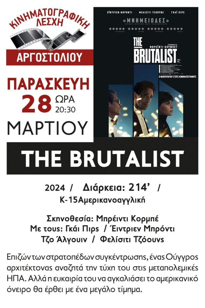 ΑρχικήΠΟΛΙΤΙΣΜΟΣ ΠΟΛΙΤΙΣΜΟΣ Κινηματογραφική Λέσχη / Προβολή Παρασκευής 28/3/25 – The Brutalist 0 28/03/2025 FacebookTwitterLinkedinEmailViber FacebookTwitterLinkedinEmailViber Προηγούμενο άρθροΠ. Δρακουλόγκωνας / Οι αποφάσεις του ΔΣ για τον αντιπλημμυρικό αγωγό Αγίας ΕυφημίαςΕπόμενο άρθροΙακωβάτειος / Διήμερο για τα Graphic Novels με αφορμή την παγκόσμια ημέρα βιβλίου ΑΦΗΣΤΕ ΜΙΑ ΑΠΑΝΤΗΣΗ Ακύρωση απάντησης Σχόλιο: εισάγετε το σχόλιό σας! Όνομα:* παρακαλώ εισάγετε το όνομά σας εδώ Email:* έχετε εισάγει εσφαλμένη διεύθυνση ηλεκτρονικού ταχυδρομείου! παρακαλώ εισάγετε εδώ την ηλεκτρονική σας διεύθυνση Ιστοσελίδα: αποθηκεύστε το όνομα, το ηλεκτρονικό ταχυδρομείο και τον ιστότοπό μου σε αυτό το πρόγραμμα περιήγησης για την επόμενη φορά που θα σχολιάσω. ΤΕΛΕΥΤΑΙΑ ΝΕΑΙΣΤΟΡΙΑΝίκος Μαραγκάκης: Μία λιγότερο γνωστή προδοσία που έπαιξε καθοριστικό ρόλο στο Μεσολόγγι (video)20/04/2026ΠΟΛΙΤΙΣΜΟΣΗ παράσταση «Ιθάκη | Ένα ταξίδι επιστροφής και αυτογνωσίας στο Δημοτικό Θέατρο Αργοστολίου20/04/2026ΚΑΘΗΜΕΡΙΝΟΤΗΤΑΑργοστόλι | Ενώνουμε δυνάμεις για τον καθαρισμό του Κουτάβου αυτή την Κυριακή!20/04/2026Status quo200 Χρόνια από την Έξοδο του Μεσολογγίου: Μια πολυεπιστημονική προσέγγιση με ιστορική τεκμηρίωση και ερμηνευτικό βάθος (video)20/04/2026PODCASTPODCAST | Η Ευρώπη Μοσχονά Viva Voce στα FM με τον Γιάννη Βαρούχα20/04/2026 Παρόμοια Άρθρα ΠΟΛΙΤΙΣΜΟΣ Η παράσταση «Ιθάκη | Ένα ταξίδι επιστροφής και αυτογνωσίας στο Δημοτικό Θέατρο Αργοστολίου 20/04/2026 ΠΟΛΙΤΙΣΜΟΣ Πρόσκοποι Κεφαλονιάς & Ζακύνθου | Στην κορυφή του Αίνου με μήνυμα περιβαλλοντικής ευαισθητοποίησης 08/04/2026 ΠΟΛΙΤΙΣΜΟΣ ΧΟΡΩΔΙΑ ΚΑΙ ΜΑΝΤΟΛΙΝΑΤΑ ΑΡΓΟΣΤΟΛΙΟΥ | Στην 1η Χορωδιακή Συνάντηση “ΣΥΝΩΔΗΠΟΡΟΙ” Ζωγράφου (βίντεο) 02/04/2026 ΠΟΛΙΤΙΣΜΟΣ Χορωδία Αργοστολίου | Αφιέρωμα στον μεγάλο μας μαέστρο και συνθέτη ΔΙΟΝΥΣΗ ΑΠΟΣΤΟΛΑΤΟ 31/03/2026 ΠΟΛΙΤΙΣΜΟΣ Τρίτεκνοι Κεφαλονιάς | Με επιτυχία το εργαστήρι Πασχαλινής Λαμπάδας 31/03/2026 ΔΗΜΟΦΙΛΗ ΑΡΘΡΑ Αίνος | του Πάνου Σταθάτου 03/03/2022 Ένα βίντεο από το 3ο Γυμνάσιο Αργοστολίου για τη γυναίκα 18/03/2022 Σε Στελιάτα, Μπαταριά, Δαφνούδι, Κιμηλιά και Έμπλυση η Ορειβατική Λέσχη (εικόνες) 29/06/2022 Πανσέληνος απ’ την παραλία Άβυθος | Πάνος Σταθάτος 07/07/2022 Μετά από 4 γενιές η οικογένεια Πετράτου σταματάει τη διανομή εφημερίδων 06/07/2022 Αφιέρωμα στο ηλιοβασίλεμα με πέντε μαγικές φωτογραφίες από τον Πάνο Σταθάτο. 18/07/2022 Το ARK στα σχολεία (εικόνες) 24/04/2023 Διονύσης Γασπαρινάτος / Λιμνοθάλασσα Κουτάβου 22/05/2024 Ωραίο το φουστάνι σου Γιώργο μου… αλλά… | π. Ξενοφώντας Ζαρκάδας 04/02/2024 Κάπου στην Κεφαλονιά… | Jerry Apostolatos 20/09/2023