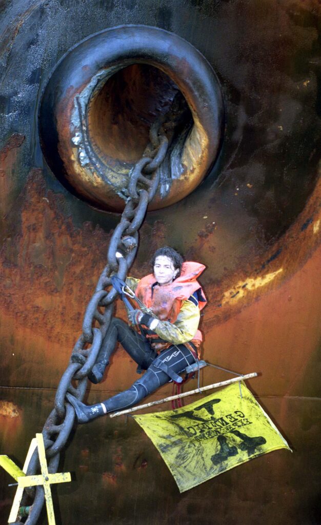 Η Αθηνά Λαμπρινίδου σκαρφαλωμένη στην αλυσίδα άγκυρας, στη Νέα Ζηλανδία. Συνεχείς και δυναμικοί αγώνες για την προστασία του περιβάλλοντος.
