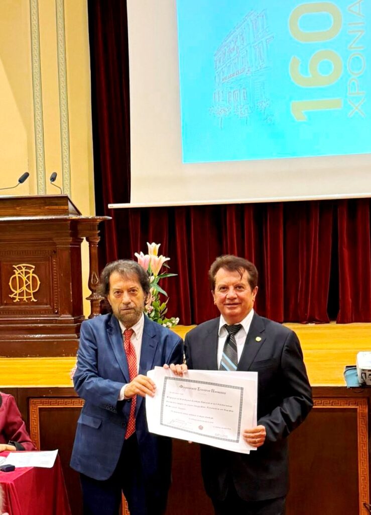 Ο καθηγητής Βασίλης Κωνσταντινόπουλος, Πρόεδρος του Παρνασσού απονέμει το δίπλωμα τακτικού μέλους στον Κώστα Ευαγγελάτο