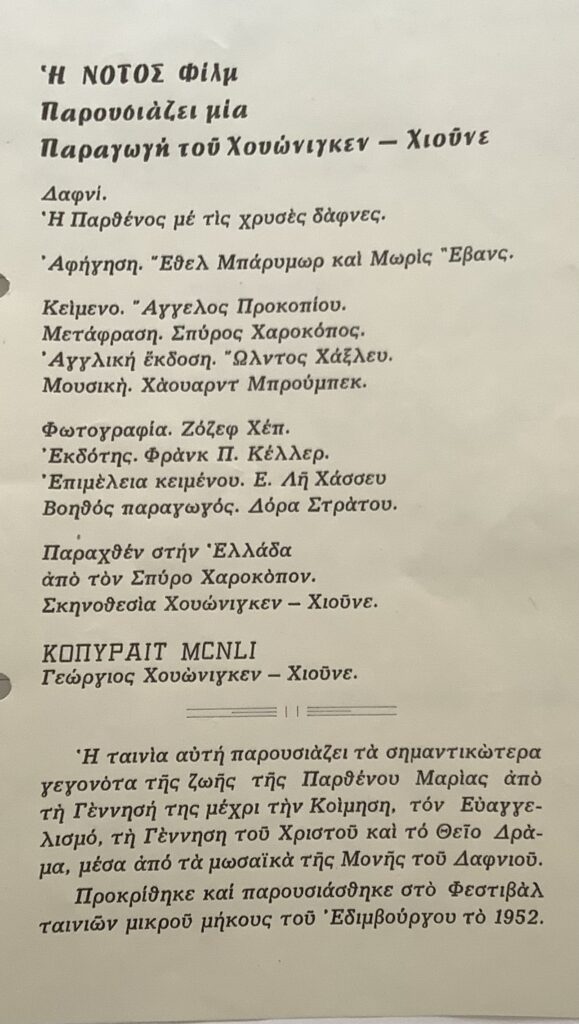 Εικ. 3. Τα στοιχεία και οι συντελεστές της ταινίας, Δαφνί. Η Παναγία με τις χρυσές δάφνες, μονόφυλλο, Αρχείο Κοργιαλενείου Μουσείου