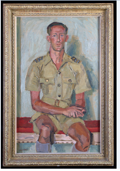 Ο εικονιζόμενος παριστάνεται μετωπικός, μπροστά από ανοικτόχρωμο τοίχο, μέχρι λίγο πιο κάτω από τα γόνατα, ευθυτενής , να κάθεται πάνω σε πάγκο με κόκκινο, μακρύ μαξιλάρι. Φορεί καλοκαιρινή στρατιωτική στολή Αεροπορίας με κοντό παντελόνι και πλέκει τα χέρια του πάνω από το αριστερό του πόδι. Πάνω σε ψηλό λαιμό εδράζεται το νεανικό κεφάλι με τα καλογραμμένα φυσιογνωμικά χαρακτηριστικά: μακρύ πρόσωπο, πλατύ μέτωπο, θεληματικό πηγούνι και ανοικτόχρωμα γαλανά μάτια.Η μορφή φωτίζεται από αριστερά, με αποτέλεσμα να πέφτει η σκιά της πάνω στο ουδέτερο βάθος δεξιά. Έτσι η μορφή απεικονίζεται σαν να «ξεκολλάει» ελαφρά από το βάθος της και να αποκτά κάποια πλαστικότητα. Ο ζωγράφος δεν χρησιμοποιεί τη φωτοσκίαση, αλλά υπερθέτει χρωματικές μονάδες διαφορετικής φωτεινότητας,κυρίως στα γυμνά μέρη, γεγονός που βοηθάει στη χρονολόγηση του έργου στο τέλος της πρώτης περιόδου της καλλιτεχνικής του δραστηριότητας (1935-1950) πιθανόν 1945-1949.Εντυπωσιάζει η ηρεμία του προσώπου με τα ορθάνοικτα μάτια και το βλέμμα στραμμένο ολόισα μπροστά και μακριά σαν να οραματίζεται κάτι.Η μετωπική, αγέρωχη στάση, το στήσιμο του κορμού και η κατεύθυνση του βλέμματος προκαλούν θρησκευτικούς συνειρμούς και αποκαλύπτουν την πρόθεση του καλλιτέχνη να εξιδανικεύσει και να αφηρωίσει τον εικονιζόμενο. Καθώς η μορφή προβάλλεται πάνω στο εντελώς ακόσμητο βάθος και ιδιοποιείται όλο τον ζωγραφικό χώρο, δεν διασπάται η προσοχή του θεατή και ο εικονιζόμενος εξαίρεται και μνημειακοποιείται. Άλλωστε, η σχεδόν ολόσωμη απεικόνιση παραπέμπει σε σπουδαία προσωπικότητα, όπως θα αναφερθεί και στη συνέχεια του παρόντος σημειώματος.Μόνο παραπληρωματικό στοιχείο στη σύνθεση αποτελεί ο πάγκος που παραπέμπει στη λαϊκή τέχνη, ένα από τα στοιχεία της παράδοσης που ενσωματώνει στα έργα του ο Τσαρούχης.