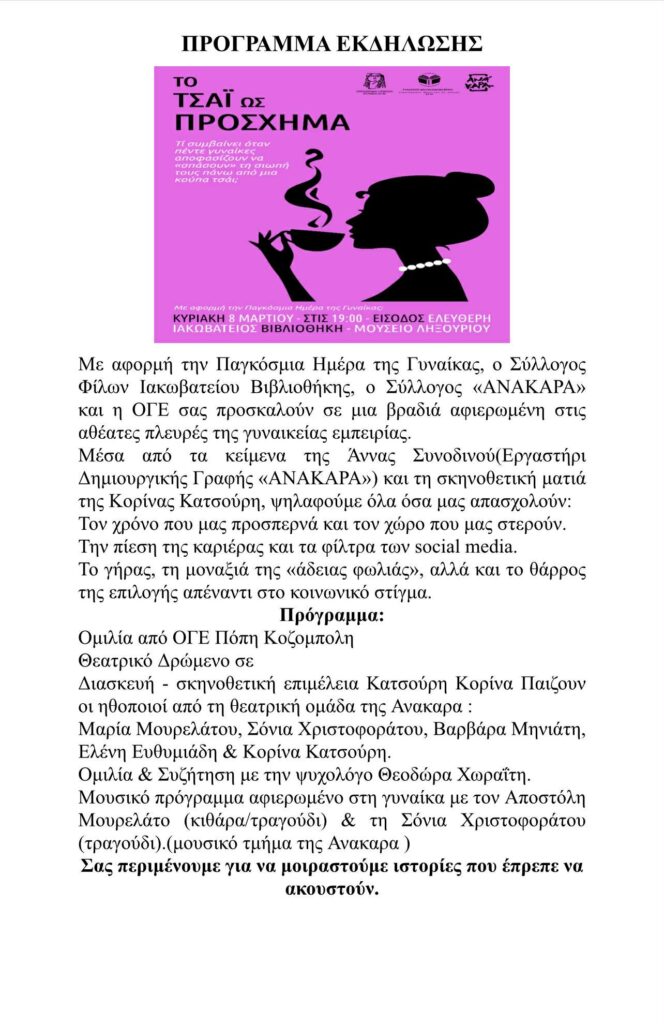 ΑρχικήΠΟΛΙΤΙΣΜΟΣ ΠΟΛΙΤΙΣΜΟΣ Το τσάι ως πρόσχημα | Τι συμβαίνει όταν 5 γυναίκες αποφασίζουν να σπάσουν τη σιωπή τους πάνω από μία κούπα τσάι 0 04/03/2026 FacebookTwitterLinkedinEmailViber FacebookTwitterLinkedinEmailViber Προηγούμενο άρθροΠαχυσαρκία | Η σιωπηλή πανδημία που απειλεί τη Δημόσια Υγεία και τη βιωσιμότητα του Συστήματος ΥγείαςΕπόμενο άρθροΊδρυμα Γεωργίου & Μάρης Βεργωτή | Συγχαρητήρια στον Χάρη Αλιβιζάτο ΑΦΗΣΤΕ ΜΙΑ ΑΠΑΝΤΗΣΗ Ακύρωση απάντησης Σχόλιο: εισάγετε το σχόλιό σας! Όνομα:* παρακαλώ εισάγετε το όνομά σας εδώ Email:* έχετε εισάγει εσφαλμένη διεύθυνση ηλεκτρονικού ταχυδρομείου! παρακαλώ εισάγετε εδώ την ηλεκτρονική σας διεύθυνση Ιστοσελίδα: αποθηκεύστε το όνομα, το ηλεκτρονικό ταχυδρομείο και τον ιστότοπό μου σε αυτό το πρόγραμμα περιήγησης για την επόμενη φορά που θα σχολιάσω. ΤΕΛΕΥΤΑΙΑ ΝΕΑPODCASTPodcast | Ο Αλέκος Καλαφάτης Viva Voce στα FM με τον Γιάννη Βαρούχα13/03/2026Viva VoceΟ Αλέκος Καλαφάτης Viva Voce στα FM με τον Γιάννη Βαρούχα (βίντεο εκπομπής)13/03/2026Status quoΓιάννης Βαρούχας: Όταν προσπαθούμε να φέρουμε τη φύση στα μέτρα μας13/03/2026ΠΑΙΔΕΙΑΠαιδική αφθονία ή συναισθηματική παράλυση;13/03/2026ΠΑΙΔΕΙΑ3ο Μουσικό Μαθητικό Φεστιβάλ Σχολείων της Δ.Δ.Ε. Κεφαλληνίας | “Με τη Μουσική… σαλπάρουμε!”13/03/2026 Παρόμοια Άρθρα ΠΟΛΙΤΙΣΜΟΣ Αυτήν την Κυριακή “Στο εσωτερικό του Maurice Maeterlinck” σε σκηνοθεσία Ελένης Παργινού 13/03/2026 ΠΟΛΙΤΙΣΜΟΣ ΑΝΑΚΑΡΑ | Ροκ συναυλία με ελεύθερη είσοδο και δυνατά ονόματα! 11/03/2026 ΠΟΛΙΤΙΣΜΟΣ ΟΚΙΣ | Εκδήλωση για την Παγκόσμια Ημέρα της Γυναίκας 10/03/2026 ΠΟΛΙΤΙΣΜΟΣ Χορωδία & Μαντολινάτα Αργοστολίου | Στην Αθήνα για δύο Χορωδιακές συναντήσεις! 09/03/2026 ΠΟΛΙΤΙΣΜΟΣ Κινηματογραφική Λέσχη | Το τραγούδι του δάσους (trailer) 09/03/2026 ΔΗΜΟΦΙΛΗ ΑΡΘΡΑ Αίνος | του Πάνου Σταθάτου 03/03/2022 Ένα βίντεο από το 3ο Γυμνάσιο Αργοστολίου για τη γυναίκα 18/03/2022 Σε Στελιάτα, Μπαταριά, Δαφνούδι, Κιμηλιά και Έμπλυση η Ορειβατική Λέσχη (εικόνες) 29/06/2022 Πανσέληνος απ’ την παραλία Άβυθος | Πάνος Σταθάτος 07/07/2022 Μετά από 4 γενιές η οικογένεια Πετράτου σταματάει τη διανομή εφημερίδων 06/07/2022 Αφιέρωμα στο ηλιοβασίλεμα με πέντε μαγικές φωτογραφίες από τον Πάνο Σταθάτο. 18/07/2022 Το ARK στα σχολεία (εικόνες) 24/04/2023 Διονύσης Γασπαρινάτος / Λιμνοθάλασσα Κουτάβου 22/05/2024 Ωραίο το φουστάνι σου Γιώργο μου… αλλά… | π. Ξενοφώντας Ζαρκάδας 04/02/2024 Κάπου στην Κεφαλονιά… | Jerry Apostolatos 20/09/2023