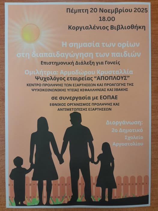 Επιστημονική διάλεξη διοργάνωσης 2ου Δημοτικού Αργοστολίου απευθυνόμενη σε Γονείς για το φλέγον ζήτημα οριοθέτησης της παιδικής παντοδυναμίας.
