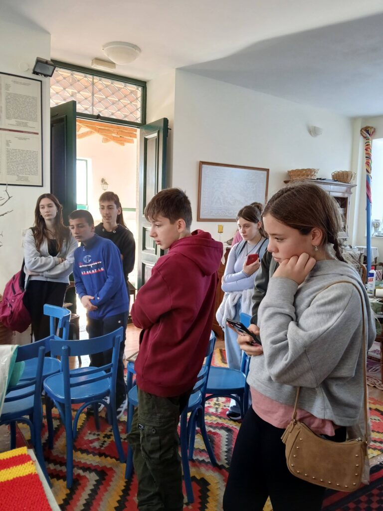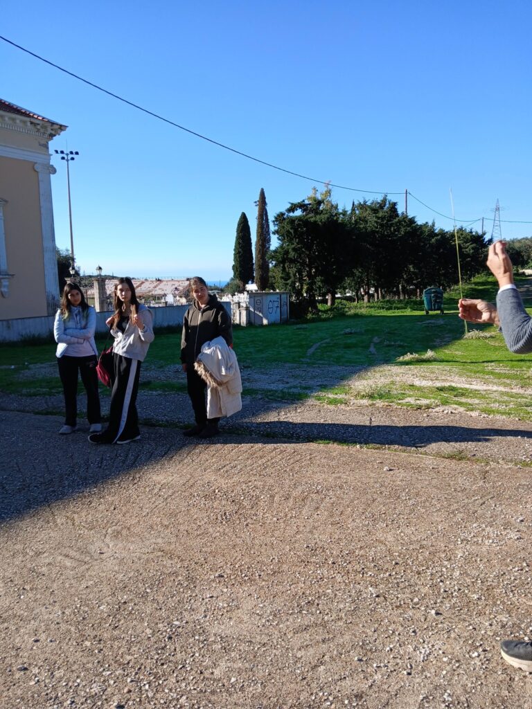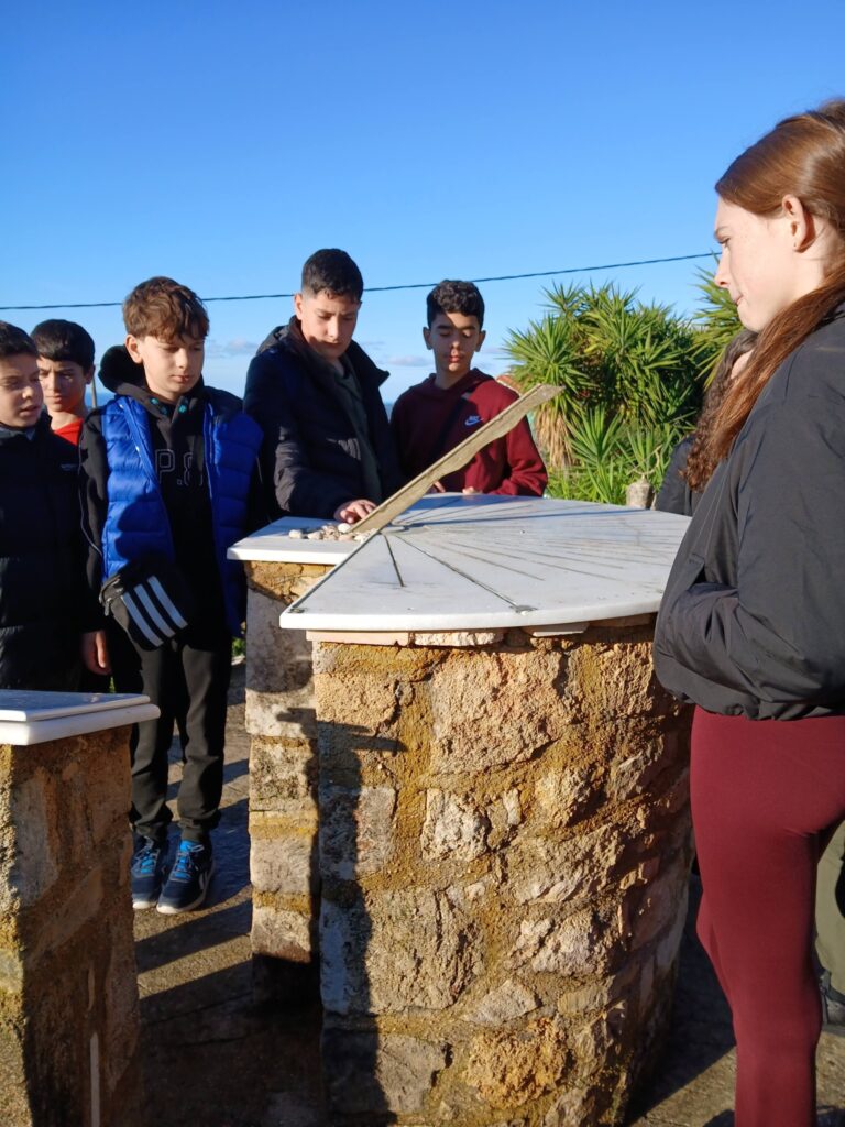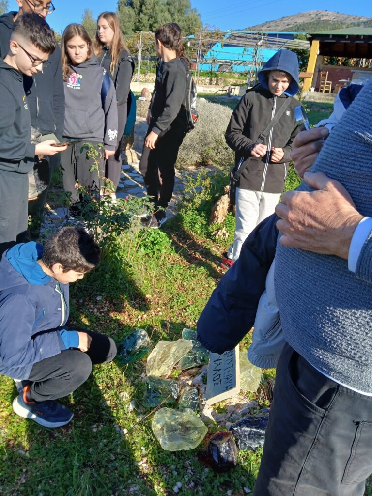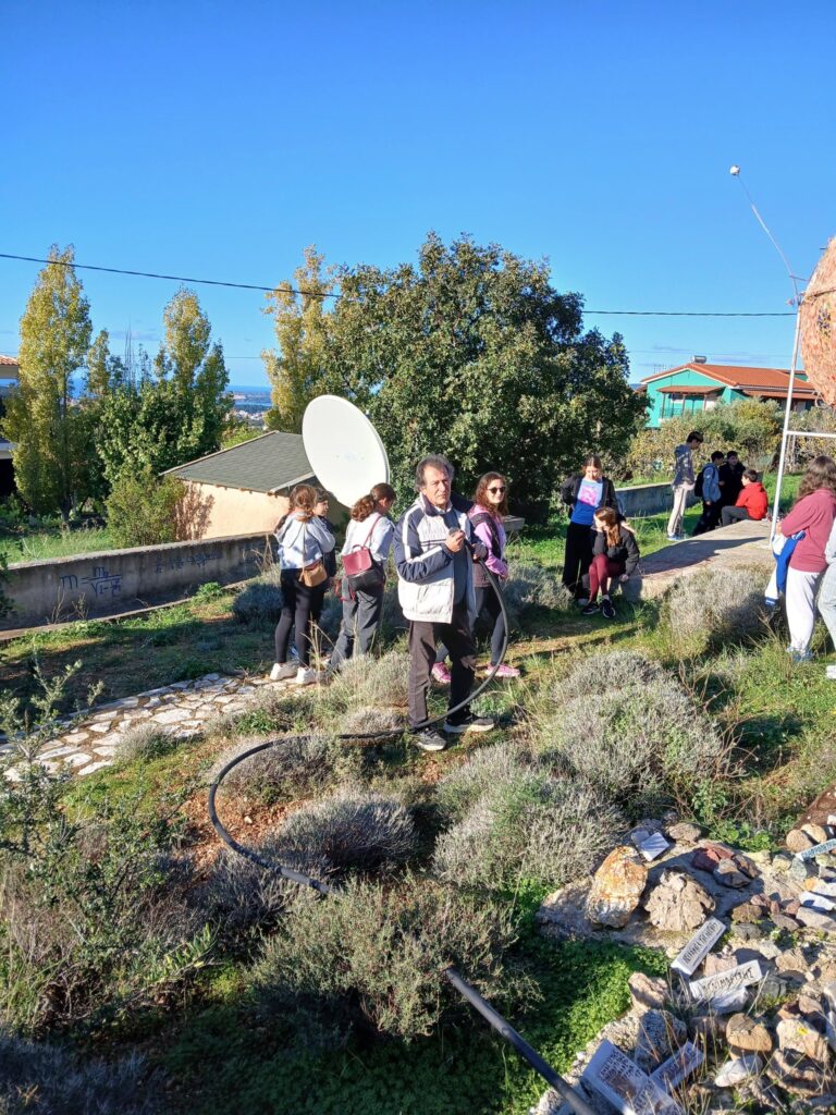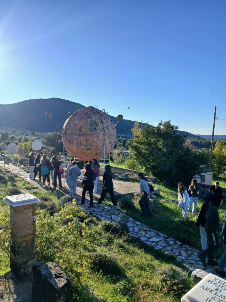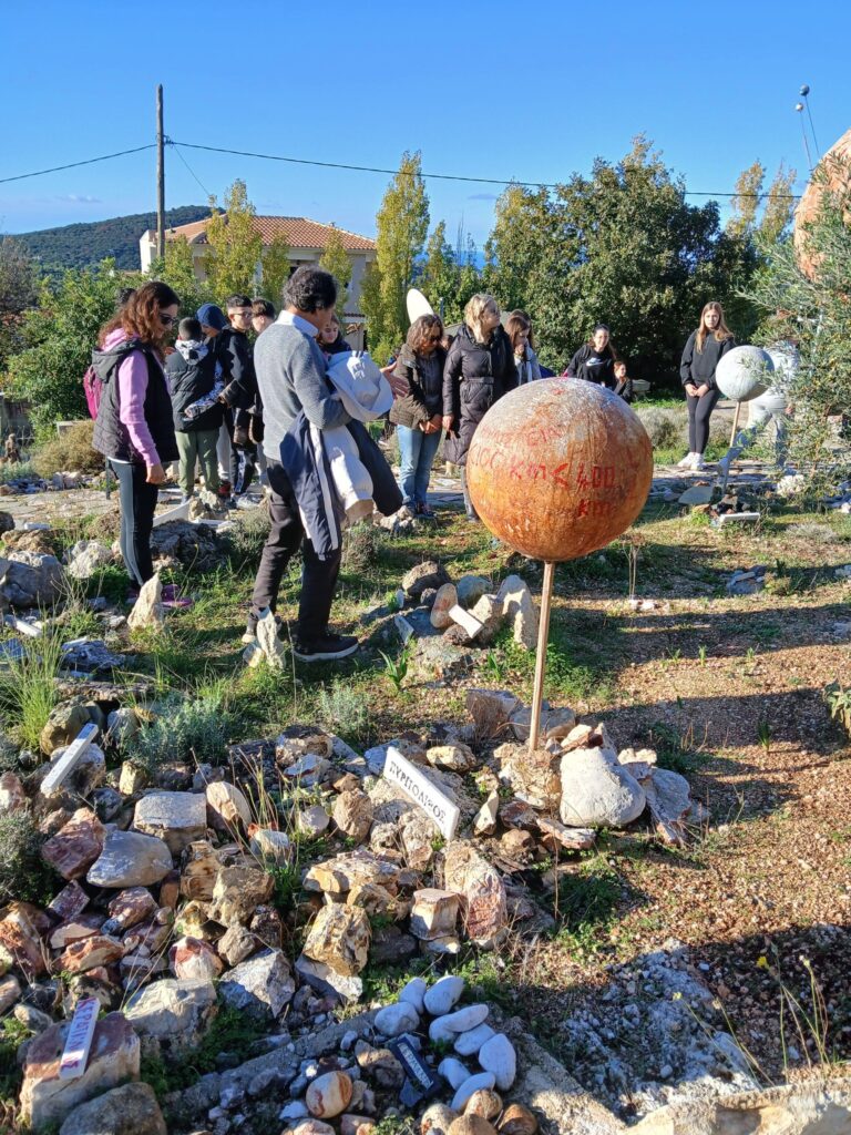 Πρώτη στάση στον πολυχώρο αστρονομίας, γεωλογίας, φυσικής, φιλοσοφίας, λαογραφίας που ο κ. Πετεινάτος έχει δημιουργήσει στα Ραζάτα. Οι μαθήτριες και οι μαθητές της Α Τάξης και έξι μαθήτριες της Β Τάξης είχαν την ευκαιρία να περπατήσουν ανάμεσα σε αγάλματα ,επιγραφές σοφών, ελιές και περνάρια,και συγχρόνως να μάθουν πολλά: έκαμαν πειράματα με ηχητικά κύματα, φόρεσαν ειδικά γυαλιά και κοίταξαν…κατάματα τον Ήλιο, είδαν πώς λειτουργεί ένα ηλιακό ρολόι, άγγιξαν παράξενα πετρώματα από διάφορα μέρη της Ελλάδας και του κόσμου, είδαν τη γιγάντια κατασκευή- προσομοίωση του Ήλιου και των πλανητών του ηλιακού μας συστήματος…