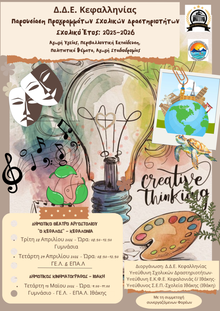 Η Διεύθυνση Δευτεροβάθμιας Εκπαίδευσης Κεφαλληνίας δια της Υπεύθυνης Σχολικών Δραστηριοτήτων σε συνεργασία με την Υπεύθυνη Ε.Κ.Φ.Ε. Κεφαλονιάς & Ιθάκης και τον Υπεύθυνο Σ.Ε.Π. διοργανώνει διήμερη εκδήλωση Παρουσίασης Προγραμμάτων Σχολικών Δραστηριοτήτων (Αγωγής Υγείας, Περιβαλλοντικής Εκπαίδευσης, Πολιτιστικών Θεμάτων και Αγωγής Σταδιοδρομίας), τα οποία υλοποιήθηκαν κατά το σχολικό έτος: 2025-2026, στο Δημοτικό Θέατρο Αργοστολίου «Ο Κέφαλος»