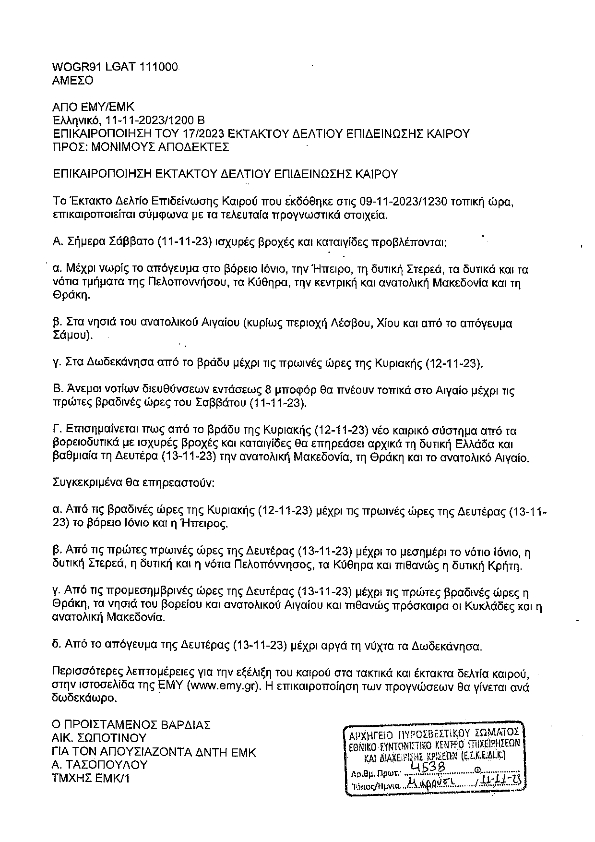 1. Σε εκτέλεση ανωτέρω σχετικής αναμεταβιβάζεται συνημμένα το επικαιροποιήμενο έκτακτο δελτίο επιδείνωσης καιρού Ε.Μ.Υ. 11-11-2023/12:00 Β , για 12 και 13-11-2023 που αφορά θαλάσσια περιοχή δικαιοδοσίας μας και παρακαλούμε για την ενημέρωσή σας.