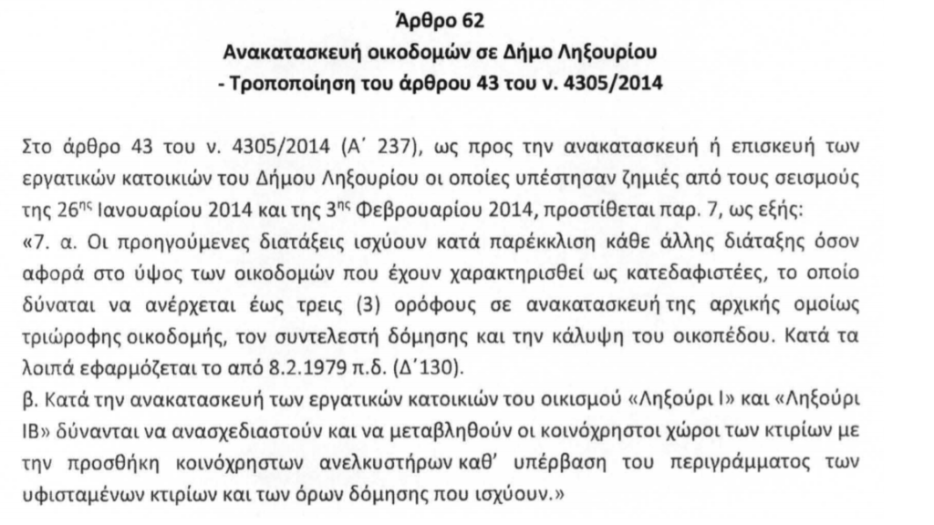 Το άρθρο 62 του Σχεδίου Νόμου αφοράστην τροποποίηση του άρθρου 43 του ν. 4305/2014 και περιλαμβάνει πολεοδομικές ρυθμίσεις για την ανακατασκευή ή επισκευή των εργατικών κατοικιών Ληξουρίου.