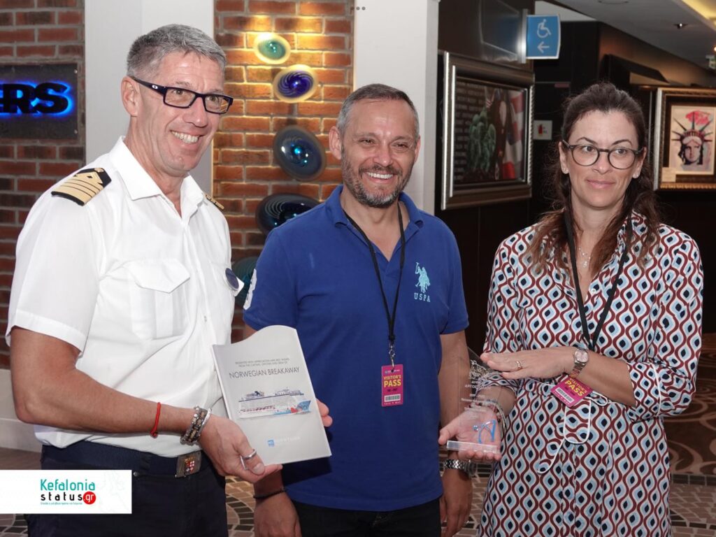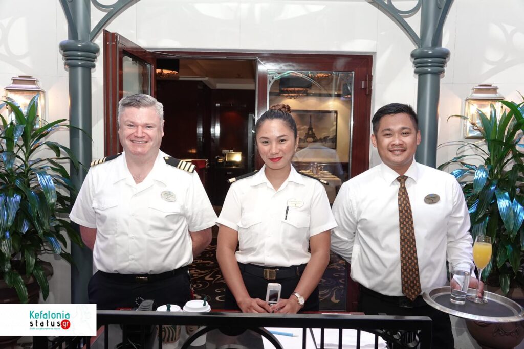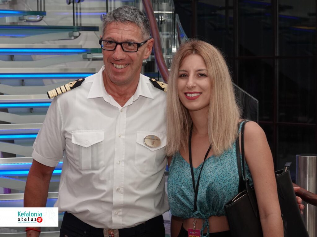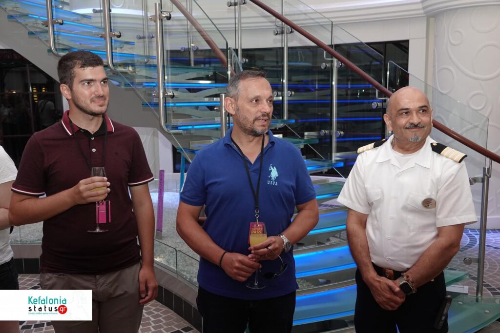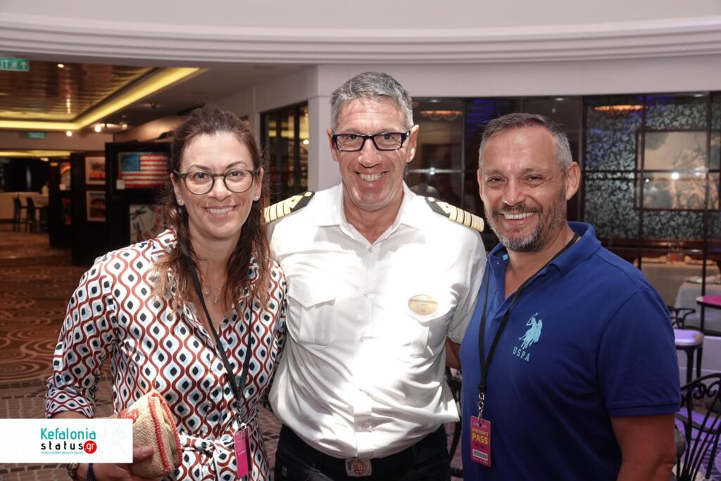 Η κ. Μαρίνα Βεργωτή, Υπεύθυνη δημοσίων Σχέσεων σε θέματα τουρισμού του Δήμου Αργοστολίου, ο Ιταλός Καπετάνιος του πλοίου cpt Marco Quartesan και το μέλος της τουριστικής επιτροπής cpt Ηλίας Στεφανάτος.
