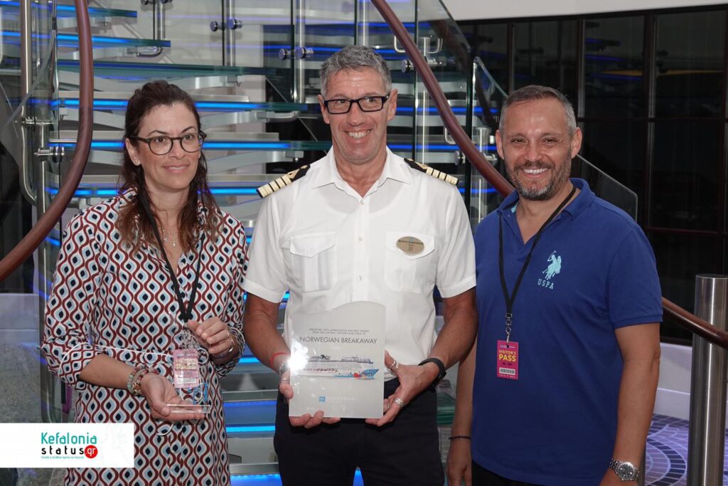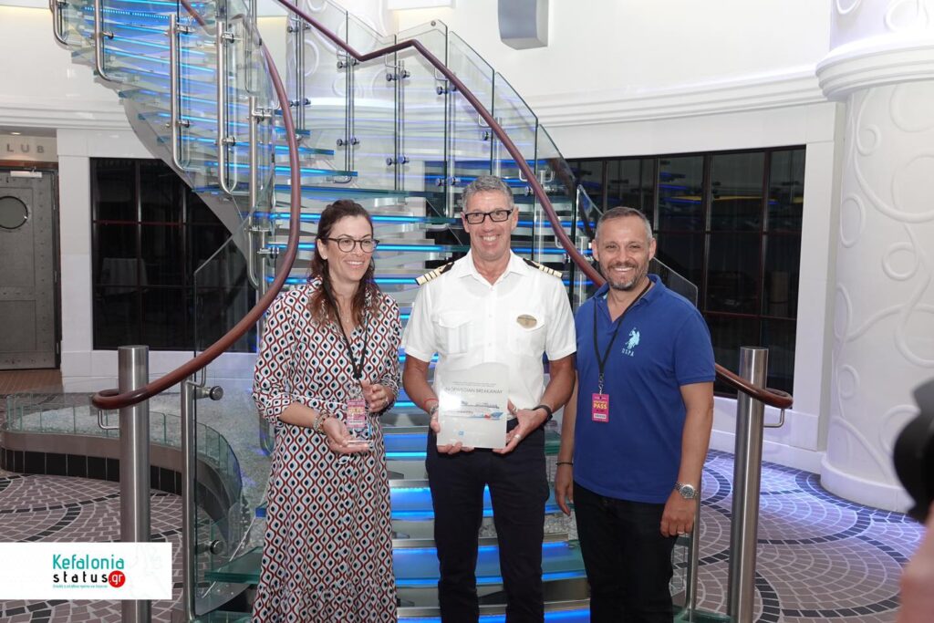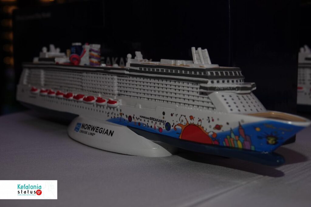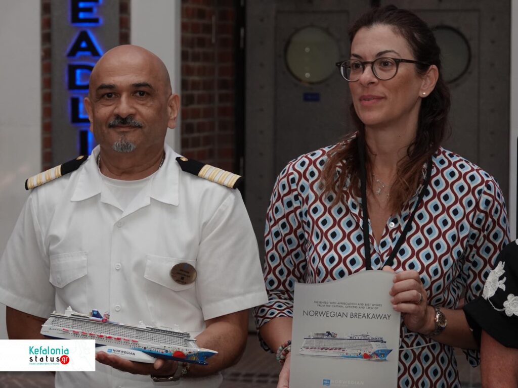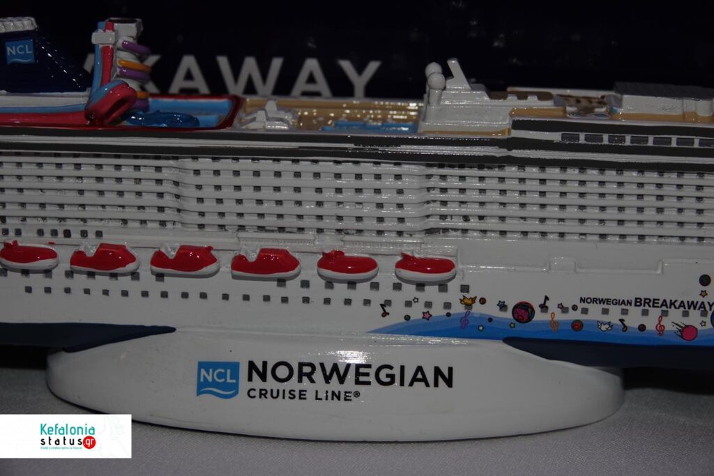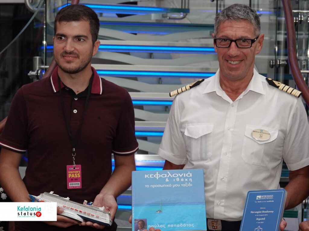 Το κρουαζιερόπλοιο Norwegian Breakaway της Norwegian Cruise line κατέπλευσε σήμερα στο Αργοστόλι και ο Ιταλός Καπετάνιος του πλοίου cpt Marco Quartesan , ο Δήμος Αργοστολίου, μέσω της Υπεύθυνης δημοσίων Σχέσεων σε θέματα τουρισμού του Δήμου Αργοστολίου Μαρίνας Βεργωτή, το μέλος της τουριστικής επιτροπής cpt Ηλία Στεφανάτο το πρακτορείο Ainos Travel Port Agency, μέσω των εκπροσώπων του, Φιορούλα Ζαμπέλη , Δημήτρη Αλυσανδράτου και της Φαίης Βαρδαράματου βρέθηκαν στο πολυτελέστατο Κρουαζιερόπλοιο και αντάλλαξαν αναμνηστικές πλακέτες, τιμής ένεκεν .
