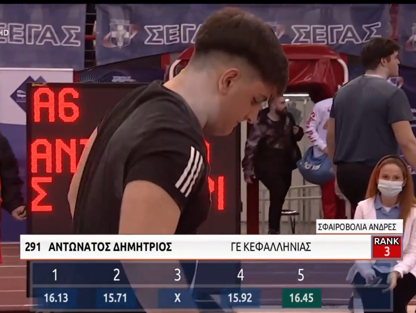 Η μεγαλύτερη διάκριση για την ομάδα μας ήρθε από τον Δημήτρη Αντωνάτο, ο οποίος στον πρώτο του αγώνα με σφαίρα βάρους 7,250 κιλών πήρε την 3η θέση με βολή στα 16.45μ. Η επίδοση αυτή είναι η καλύτερη που έχει σημειωθεί από αθλητή της Κεφαλονιάς τα τελευταία 20 χρόνια!