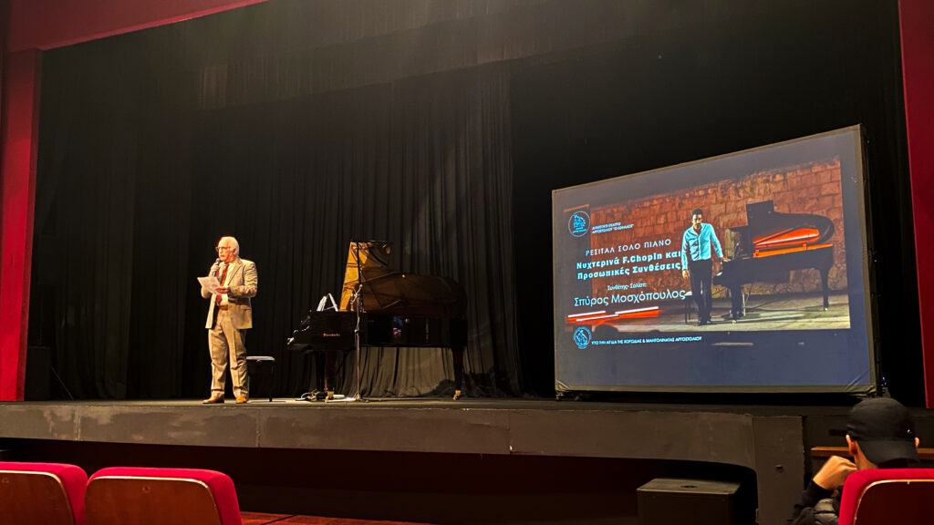 Κάτω από τον ζεστό φωτισμό της σκηνής, εκεί όπου η σιωπή γίνεται προσμονή, ο ήχος του πιάνου άνοιξε δρόμο σαν ανάσα νυχτερινού αέρα. Στο σπουδαίο ρεσιτάλ σόλο πιάνου του Σπύρου Μοσχόπουλου, οι νότες δεν ήταν απλώς ήχοι, ήταν βήματα προς έναν εσωτερικό ορίζοντα, εκεί όπου ο Chopin συναντά τη σύγχρονη δημιουργία και η μνήμη συνομιλεί με το παρόν.