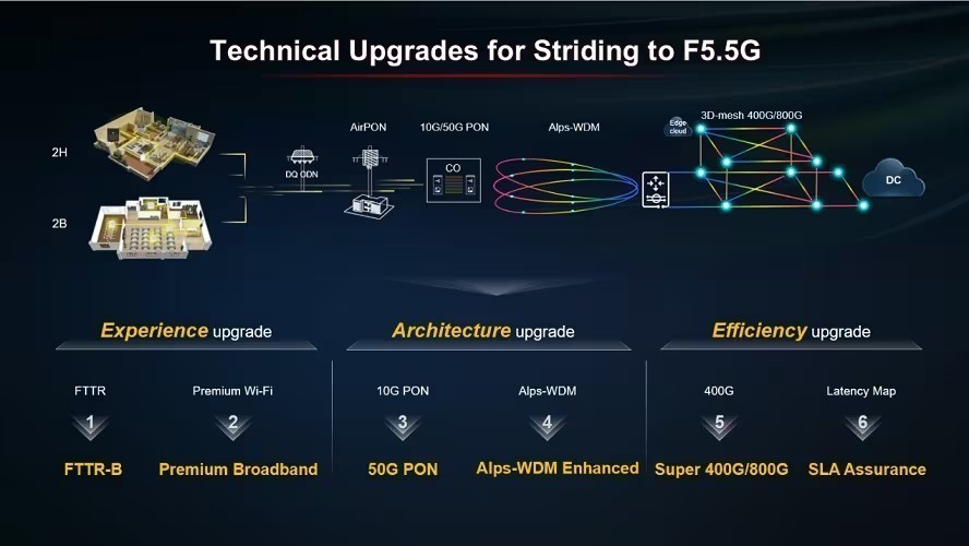 Κατά τη διάρκεια του UBBF στο Ντουμπάι, παρουσιάστηκαν επιπλέον οι καινοτομίες F5.5G της Huawei, οι οποίες στοχεύουν να ενισχύσουν τις δυνατότητες του δικτύου και να οδηγήσουν σε έναν θετικό επιχειρηματικό κύκλο. Αυτές οι αναβαθμίσεις έχουν ως στόχο μελλοντικά να προωθήσουν τη συνολική βελτίωση της εμπειρίας, της αρχιτεκτονικής και της αποτελεσματικότητας, βοηθώντας έτσι τους παρόχους να επιταχύνουν την επιχειρηματική επιτυχία κατά τη διάρκεια της ομαλής εξέλιξης στο F5.5G. Η Huawei καλεί, επίσης, όλα τα μέρη του κλάδου να προωθήσουν από κοινού την ωρίμανση και την εφαρμογή του F5.5G, και σταδιακά, να επιτύχουν ταχύτητες 10Gbps «10Gbps Everywhere».