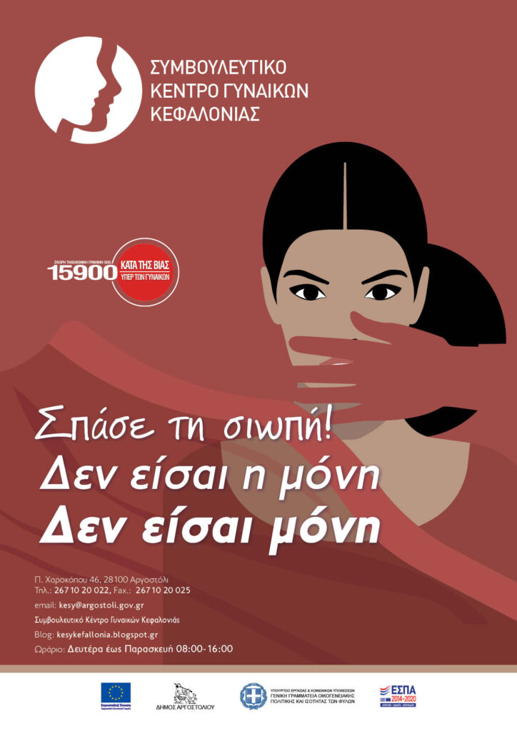 Με το μήνυμα «δεν είσαι (η) μόνη – δεν είσαι μόνη» ενθαρρύνονται όλες ανεξαιρέτως οι γυναίκες που υφίστανται έμφυλη βία ή/και πολλαπλές διακρίσεις να σπάσουν τη σιωπή τους και να απευθυνθούν στο Συμβουλευτικό Κέντρο Γυναικών Κεφαλονιάς, ώστε να λάβουν δωρεάν και εχέμυθα τις εξειδικευμένες υπηρεσίες μας.